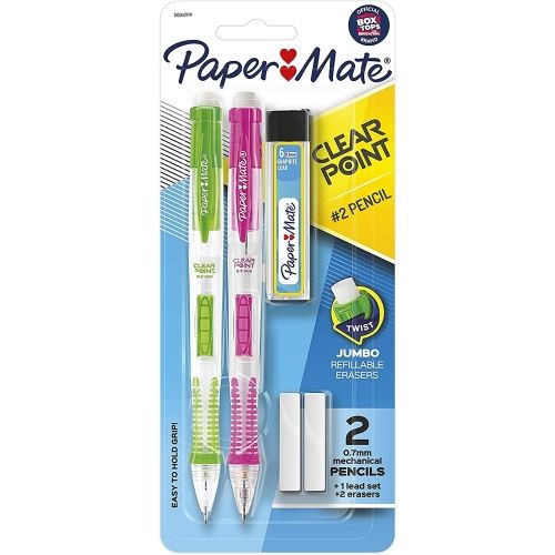 The Paper Mate Clearpoint Mechanical Pencil is a precise, fully-featured writing instrument that is ideal for standardized tests, drafting, and homework. These pencils feature a convenient side-click advance mechanism on the barrel that advances the lead with just a click. The textured over-molded grip provides comfort and control during long writing sessions, while the jumbo twist-up eraser lets you easily correct mistakes without any smudges or tearing. Retractable (Yes/No): Yes; Eraser (Yes/No): Yes; Graphite Color(s): Black; Color Family: Black.
