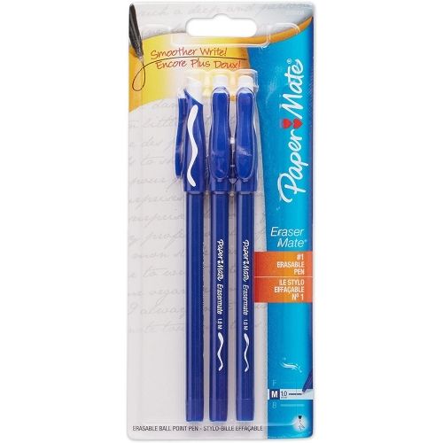 Paper Mate Erasermate Stick Medium Tip Ballpoint Pens, Blue Ink, 3/Pack