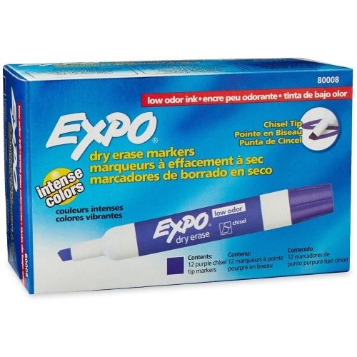 Markers feature bold ink that's easy to see from a distance and provide consistent color quality. These Expo dry erase markers erase cleanly and easily from whiteboards and other non-porous surfaces with a dry cloth or Expo eraser. The dry erase marker ink is specially formulated to be low-odor, making it perfect for use in classrooms, offices and homes. Use your Expo whiteboard markers to track, schedule and present. Marker Ink Type: Dry Erase; Marker Tip Type: Chisel; Marker Tip Size (text): Broad; Marker Color(s): Purple.