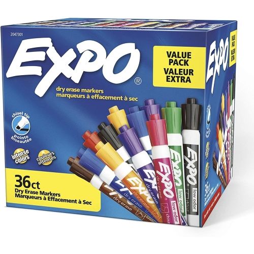 Markers feature bold ink that's easy to see from a distance and provide consistent color quality. These Expo dry erase markers erase cleanly and easily from whiteboards and other non-porous surfaces with a dry cloth or Expo eraser. The dry erase marker ink is specially formulated to be low-odor, making it perfect for use in classrooms, offices and homes. Use your Expo whiteboard markers to track, schedule and present. Value Pack—Stock up and save! Marker Ink Type: Dry Erase; Marker Tip Type: Chisel; Marker Tip Size (text): Broad; Marker Color(s): Assorted.