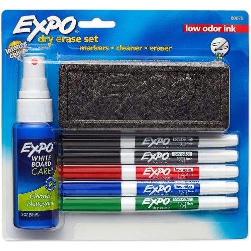 Great for meeting rooms, classrooms and when you're on the go. You get everything you need, all stored in a handy, durable case. Includes eight chisel tip bold color markers, four fine tip bold color markers, an EXPO® eraser and an 8-oz. bottle of EXPO® cleaner. Marker Ink Type: Dry Erase; Marker Tip Type: Bullet; Marker Tip Size (text): Fine; Marker Color(s): Assorted.