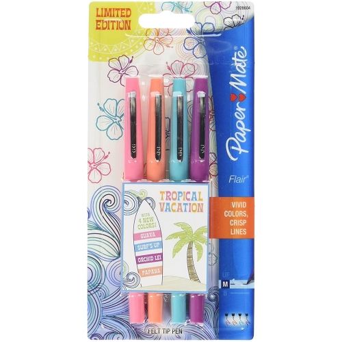 Add bright, vivid details to your writing and drawing with Paper Mate Flair Felt Tip Pens. Featuring a comfortable barrel grip and high-quality water-based inks, these pens are compatible with most surfaces and won’t bleed through paper. These pens feature point guards that prevent the tips from fraying and drying out to keep your pen fresh. Every stroke produces bold, clean lines that are perfect for drawing, editing documents and checking papers. Limited Edition Tropical Vacation Colors. Pen Sub-Brand & SKU Line: Point Guard® Flair® Felt Tip; Pen Style: Stick; Pen Type: Porous Point Pen; Refillable (Yes/No): No.