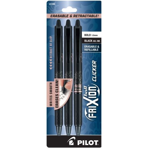 Pilot Frixion Clicker Erasable Gel Pen, Retractable, Bold 1 Mm, Black Ink, Black Barrel, 3/Pack