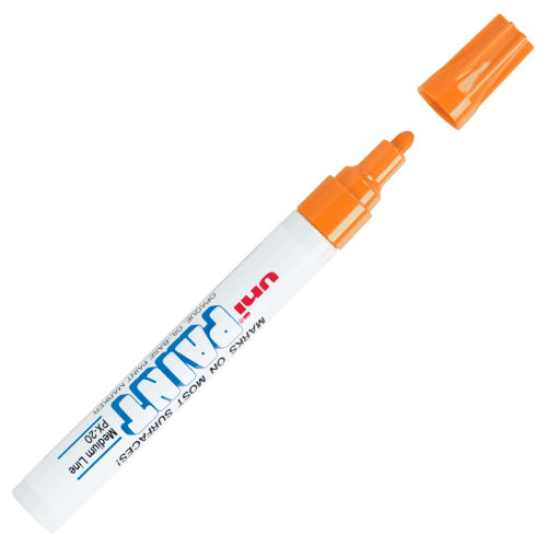 Create long-lasting artwork with uni Paint Markers. These permanent paint markers can be used on glass, metal, stone, plastic, wood, and other surfaces. The oil-based formula is glossy and opaque, and produces bold marks. Marker Ink Type: Permanent; Marker Tip Type: Bullet; Marker Tip Size (text): Medium; Marker Color(s): Orange.