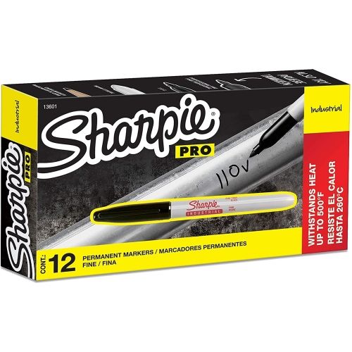 Sharpie Professional Industrial Permanent Markers feature durable permanent inks that resist fading when put to commercial use. The ink is suited for industrial applications, including extreme heat (up to 500 degrees Fahrenheit). These permanent markers can be used on most materials including metal, glass, plastic, film, and foil. Marker Ink Type: Permanent; Marker Tip Type: Bullet; Marker Tip Size (text): Fine; Marker Color(s): Black.