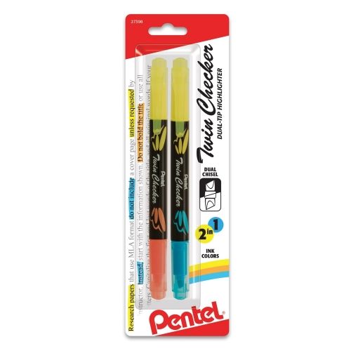 Pentel Twin Checker Dual-Tip Highlighter, Chisel Tip, Assorted Colors 2/Pack